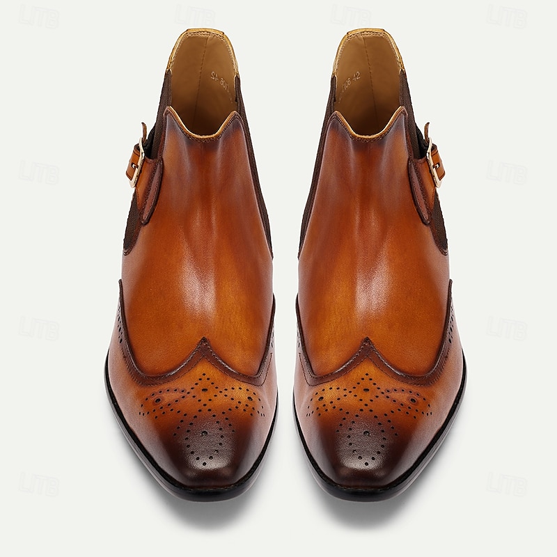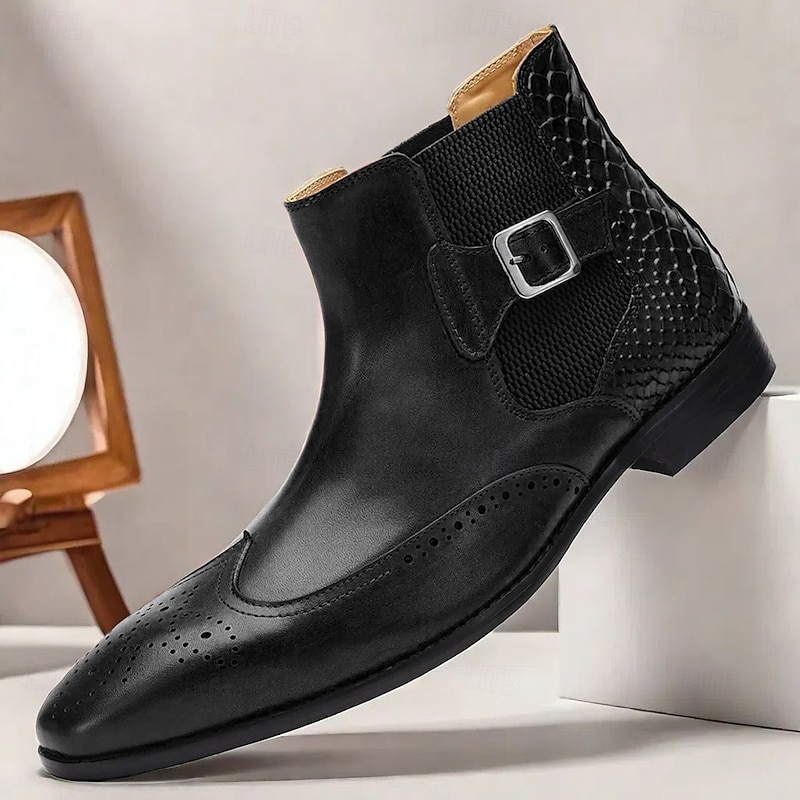 Highlights [Fabric and Style] : Crafted from 100% premium cowhide leather, these men's Chelsea boots offer a luxurious feel and embody classic sophistication. The intricate brogue detailing across the toe cap enhances their timeless appeal, while the rich brown leather with a polished finish adds an element of elegance suitable for a variety of occasions. [Design Highlights] : A snakeskin-like textured accent on the side provides a contemporary twist to the traditional Chelsea boot style. The elastic side panel, typical of Chelsea boots, is paired with a decorative buckle strap not just for added style but also to ensure a snug, comfortable fit. [Occasions] : Perfect for both formal and smart-casual events, these boots are versatile enough to be worn at the office, formal gatherings, or a fashionable night out. Their sophisticated design ensures they complement any outfit with ease. [Comfort and Function] : The interior is lined with soft leather, promising exceptional comfort throughout the day. A durable rubber sole offers excellent traction and slip resistance, making these boots a reliable choice for fall and winter wear. [Size Range] : Available in a range of sizes from US6 / EU39 / UK5 to US13 / EU46 / UK12, catering to a wide array of foot sizes.