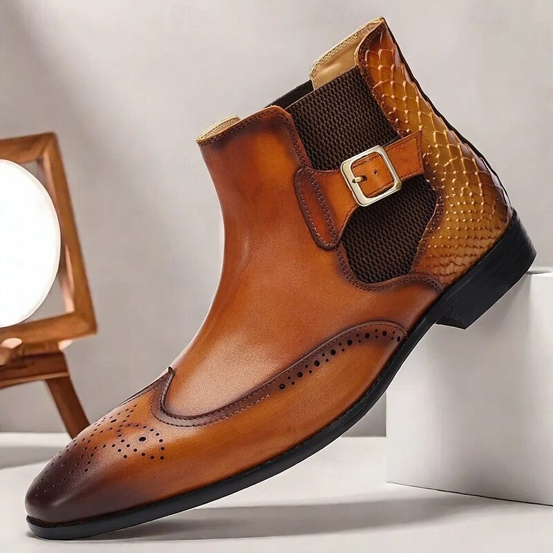 Men's Brown Ankle Boots with Brogue Detailing & Snakeskin Accent - Premium Cowhide Leather Dress Boots for Formal & Casual Wear 1
