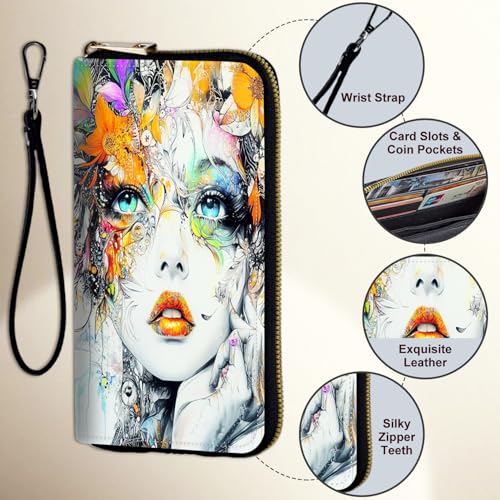 Wristlet Wallet for Women Teen Girls Womens Wallet RFID Blocking Credit Card Holder with Removable Wristlet,Leather Phone Wallet Clutch Large Capacity Ladies Travel Purs,Beautiful Woman Flower 5