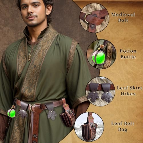 Fabric type: 100% LeatherCare instructions: Dry Clean OnlyOrigin: Imported【 Christmas Renaissance Belt Set】The package comes with 6 pieces of Renaissance belt accessories, including 1 medieval belt, 1 renaissance belt pouch, 1 potion bottle (PET) with cork, 1 bottle sleeve, 1 renaissance skirt hike, and 1 medieval mug strap. Comprehensive set to meet your costume needs, enough to recreate the classic medieval look for both men and women【Premium Leather】Our medieval accessories belt pouch made of quality PU leather and vintage alloy buckle, wear-resistant and durable, smooth and soft for long-term use. In addition, all accessories are colored in vintage colors, in line with latest aesthetics while maintaining a medieval retro vibe【Size Information】The renaissance belt is designed with a size of about 63 * 1.4 inches (Fit waist max: 57 inches), can be adjusted and tightened at will to make it more comfortable. Medieval belt bag is about 7.1 * 1.38 inches, the potion bottle(PET) with cork have a capacity of about 7.0 oz/ 200 ml, medieval mug strap is about 5.7 * 1.5 inches, and skirt hike is about 5.7 * 1.5 inches, ring wide 2.17 inches【Reliable and Practical】Use the medieval belt pouch for storing small items(Such as your cash, keys, dice and more), secure skirts with the skirt hike clip, adjust the waistline with leather belt, and the potion bottle incorporate fantasy elements or gadgets, in the practical at the same time, but also show a sense of mystery, let people seem to be in the Middle Ages history river【Suitable for Various Occasions】The renaissance leather belt pouch are ideal for renaissance circus, Halloween, makeup party, drama performance, cosplay party, fantasy activity, photography, celebration, historical activity and so on【Gifts Belts For Men】 The medieval viking belt for men an ideal gift for men, perfect for any dress up occasion, great gift for father's day, Christmas, Halloween costume, cosplay party, anniversary, thanksgiving day, valentine's day, graduation, birthday and casual,medieval theme parties. Perfect for everyday use. first-class materials and excellent craftsmanship ensure long-lasting durability.