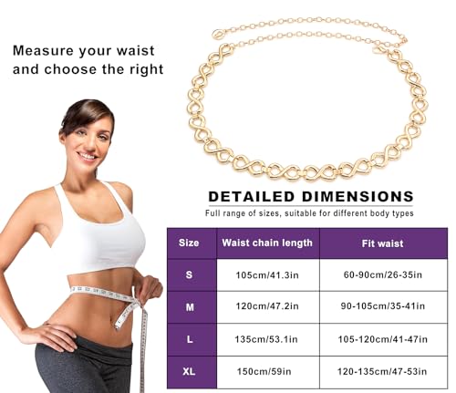 Care instructions: Dry Cloth CleanOrigin: ImportedMaterial: The gold chain belt is made of alloy, which is sturdy, well-made, and not easy to fade and break; The hollow gold chain belt will make you look more shiny and striking in the crowd.Size: Four size to choose which is suitable for most people. Length: 105cm/41.3in, Fit Waist 26-35. Length: 120cm/47.2in, Fit Waist 35-41. Length: 135cm/53.1in, Fit Waist 41-47. Length: 150cm/59in, Fit Waist 47-53.Design: This chain belt uses a hollow design, revealing a stylish and elegant atmosphere, very lovely, and can add a touch of bright color to your outfit.Occassion: This metal belt can be used with dresses, coats, tops, shirts, blouses, bikini suits, etc. The gold belt is suitable for you to attend parties, dinner parties, graduations, wedding, beach parties, having dates or other casual occasions.Service: Your happiness is our priority! If you have any questions or concerns, contact us anytime. We promise a prompt response within 12 hours and a satisfying solution. Perfect for everyday use. first-class materials and excellent craftsmanship ensure long-lasting durability.