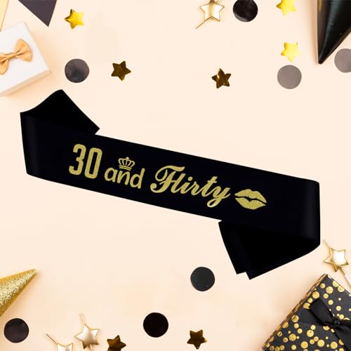 30 and Flirty Sash,Black Sash with Gold Foil Happy 30th Birthday Sash for Men and Women, Thirtylicious Dirty 30 Sash, 30th Birthday Gift Idea Fun Party Sash