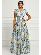 More information about A-Line Evening Gown Elegant Dress Formal Wedding Guest Floor Length Short Sleeve V Neck Pocket Satin with Floral Print Wedding Guest Dress
