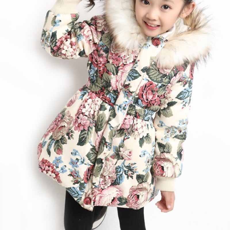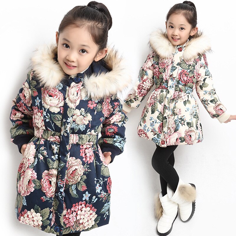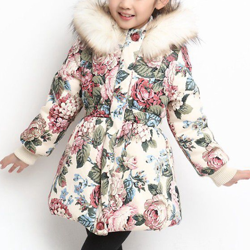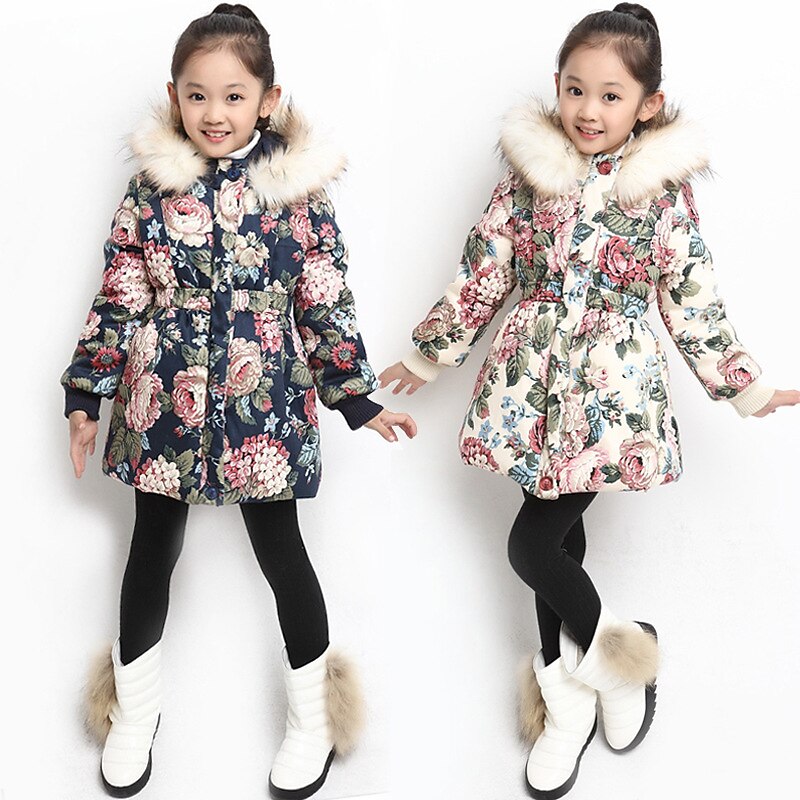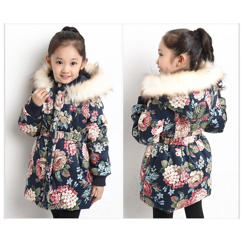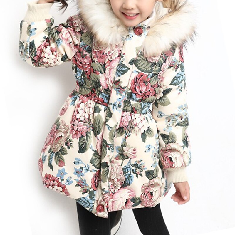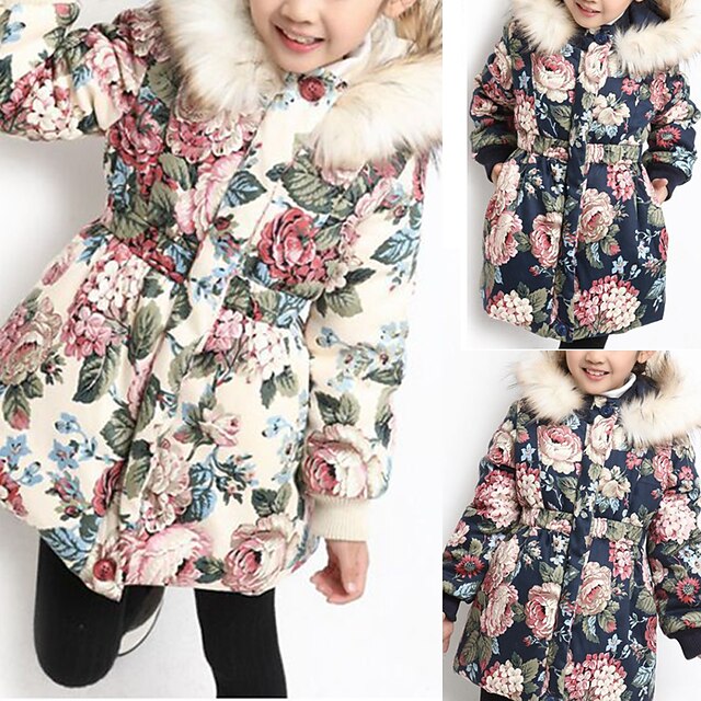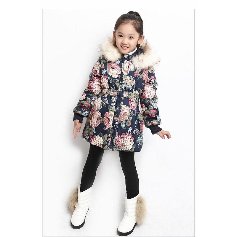 sizzling ! Kids Girls' Down Coat Floral Fashion Outdoor Cotton Coat Outerwear 3-12 Years Fall Navy Blue Beige