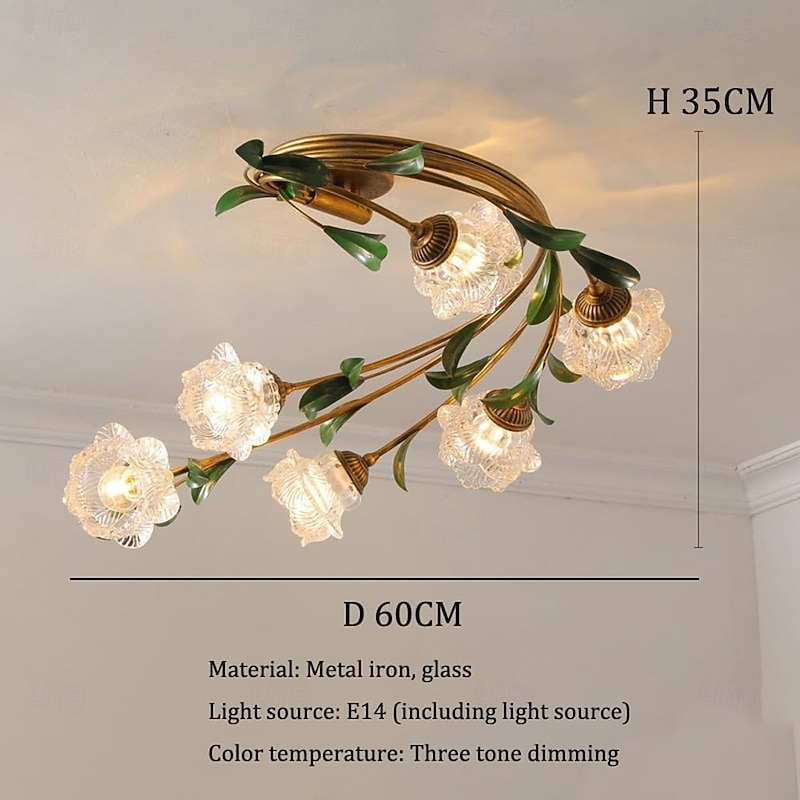 More information about 6-Light Floral Ceiling Light, Vintage Tulip Flower Semi-Flush Mount Ceiling Lamp, Gold Metal Branch with Frosted Glass Shades for Living Room, Bedroom