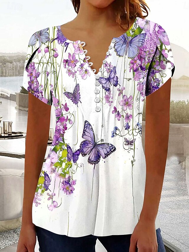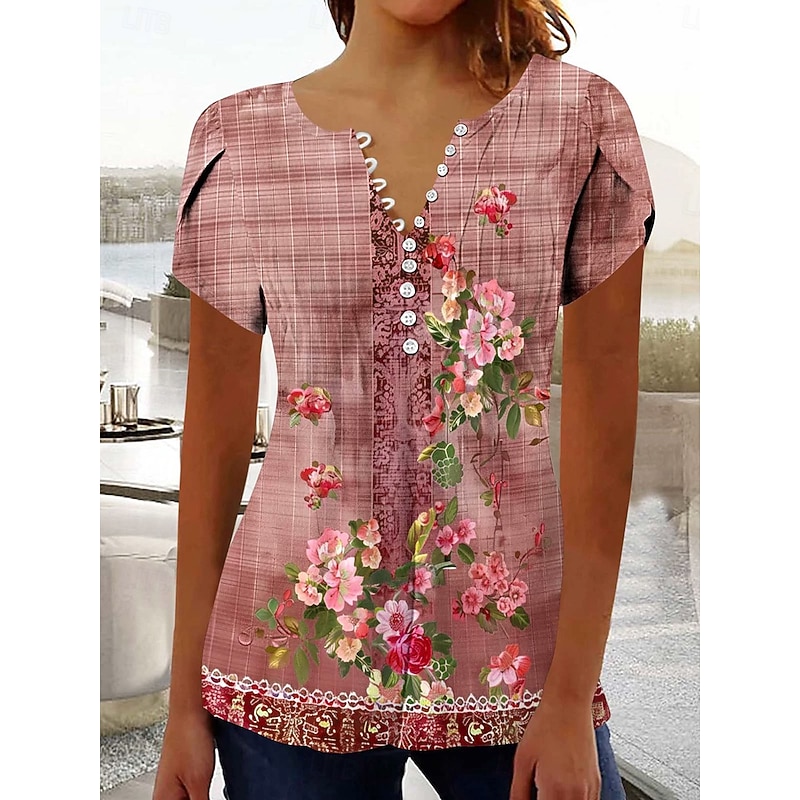 Why Choose Women's Boho Shirt Ombre Floral Graphic Bohemia Vintage Daily Sleeveless Short Sleeve Notched Neck Regular Tops Daily Holiday Vacation Wear Ruffle Smocked Sage Green Black Red Blue Purple Summer?