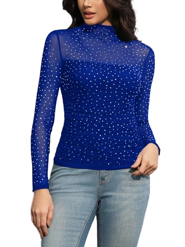 • FEATURE: Rhinestone Mesh Shirt, Long sleeve, Turtle neck, Mock neck, Ruched, Shirred, Bodycon slim fit, Sexy and casual style, Sexy blouse, Rhinestone top, Iridescent top, Studded top, See through blouse party tops. outstanding pair with dress, leather pants, leggings, jeans, shorts and skirt, also can be matched with blazers, cardigan, coats, sweaters in cold days, showing your charming body curves and feminine, excellent for summer, spring, fall and winter wear.