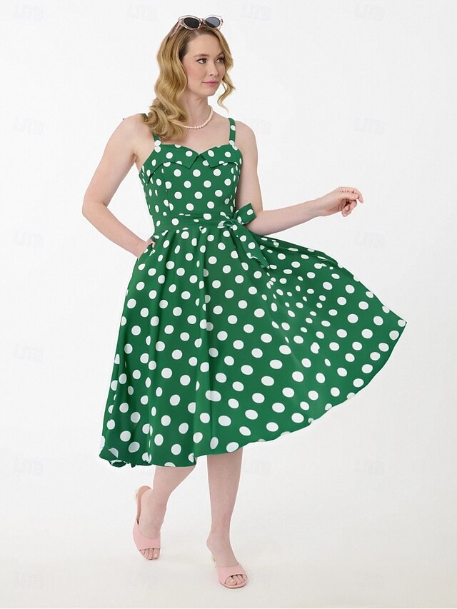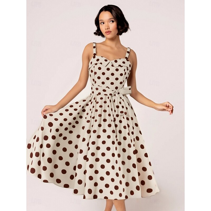 Retro Vintage 1950s Grease Outfits Rockabilly Midi Dress Swing Dress Flare Dress With Belt Spaghetti Strap Polka dots A-Line Fancy Dress Women's Carnival Daily Wear Tea Party Retro Adults Dress Spring 24