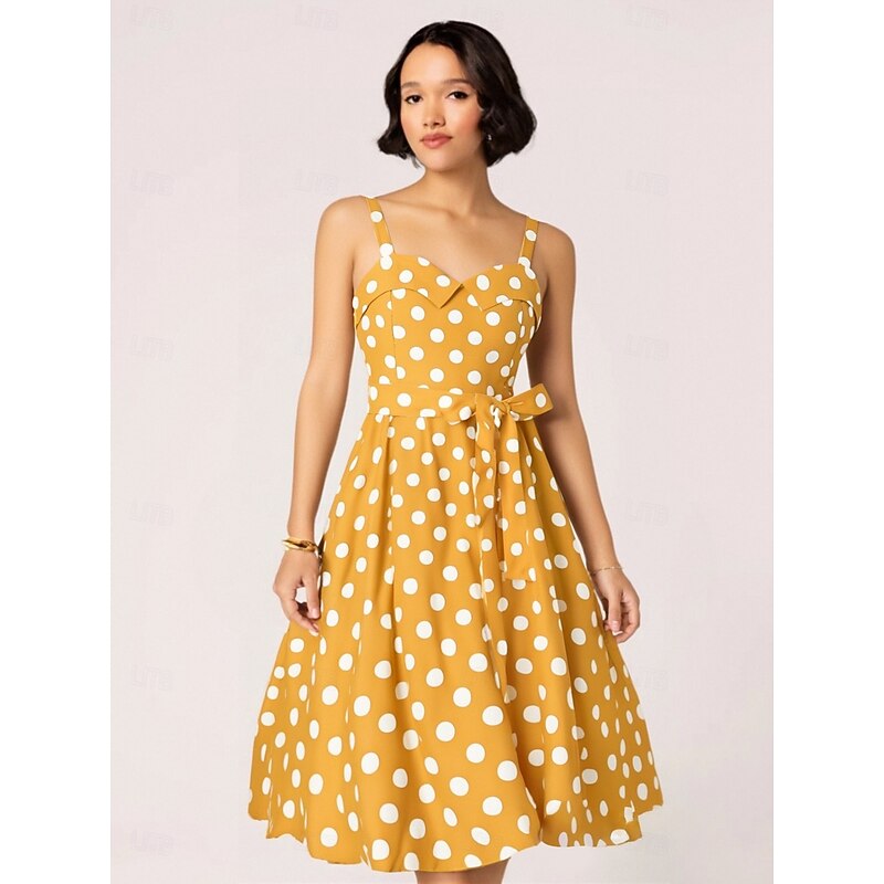 Retro Vintage 1950s Grease Outfits Rockabilly Midi Dress Swing Dress Flare Dress With Belt Spaghetti Strap Polka dots A-Line Fancy Dress Women's Carnival Daily Wear Tea Party Retro Adults Dress Spring 25