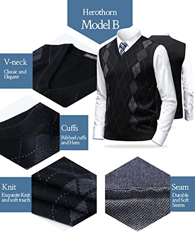 Fabric type: 20% Wool, 80% Acrylic & Polyester BlendCare instructions: Hand Wash OnlyOrigin: Imported【FEATURES】V-neck style sweater vest: to make your neck look as if longer. Argyle pattern design in colors: to match with different short and long plain or plaid shirts more easily. Classical design sleeveless sweater waistcoat is also featured with good elasticity so this casual slim fit sweater vest does not shrink.【COMFORTABLE FABRIC】This fashion solid color sweater vest is made of soft wool fabric which is skin friendly. This modern pullover sweater vest is suitable for seasons like Fall(Autumn) Spring and Winter.【VARIOUS COLORS AND FIVE SIZES】Herothorn's Casual Sleeveless Argyle vest designs various classic and casual colors as well as various sizes for you to choose. Black, Dark Grey, Camel or Navy blue are available for you to choose, and size from S to XX-Large. You can easily find one mens sweater vest XXL or more suitable for yourself and your dear families or friends.【OCCASIONS】Herothorn mens Knit Pullover Vest is suitable for varies occasions like outdoor activities, date, office, business work, interview, travel, birthday party, Christmas, golf, daily casual home wear etc. It is appropriate for both young men and elder men.【NOTICE】The size is comparably smaller, ordering 1 SIZE UP is recommended. Washing notice: Gentle machine washable with laundry bag. Washing by hand in cold water recommended. Hang dry or tumble dry low. Please refer to our size chart compare to your body measurement for size selection carefully before placing orders. Perfect for everyday use. superior materials and excellent craftsmanship ensure long-lasting durability.