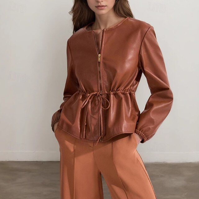 sizzling ! Women's Faux Leather Jacket Casual Jacket relaxing Drawstring Zipper Fashion Plain Outdoor Street Going out Casual Daily Zipper Long Crewneck Regular Fit Long Sleeve Outerwear Brown Fall