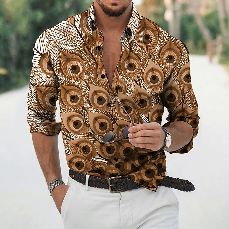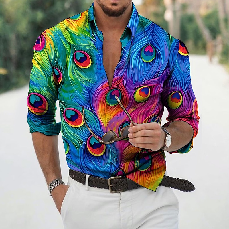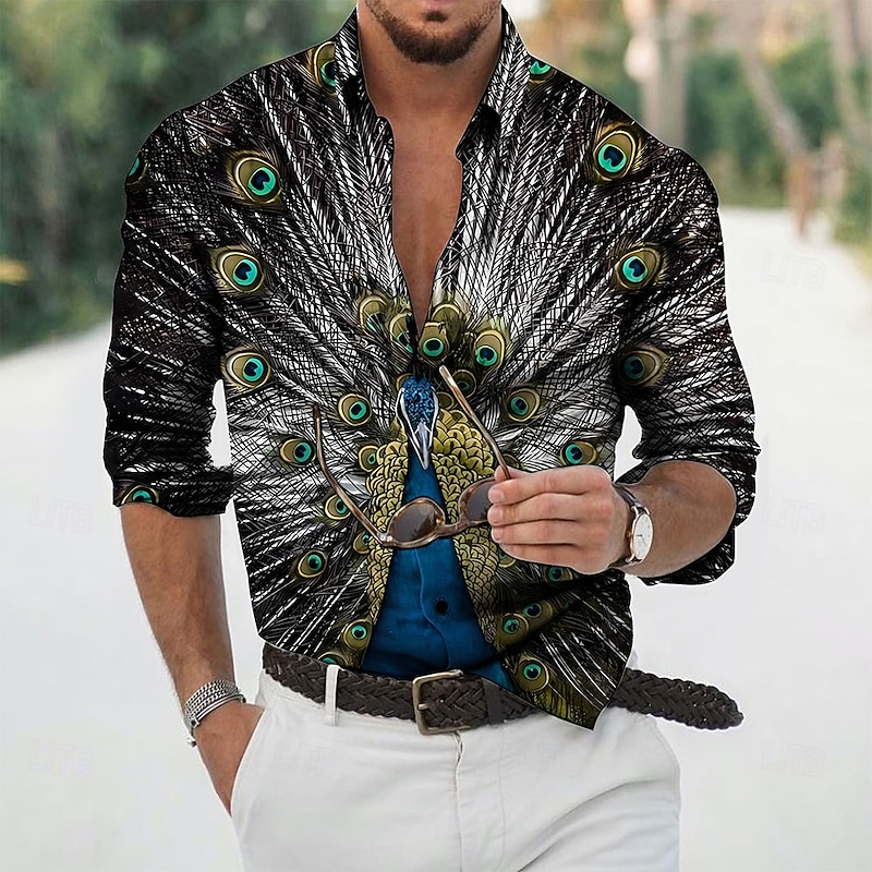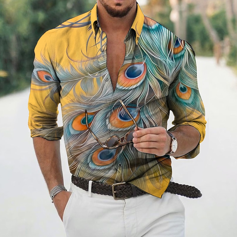 More information about Men's Feather Shirt Aloha Shirt Long Sleeve Fashion Designer Casual Outdoor Vacation Daily Spring & Summer Stand Collar 3D Print Button-Down Black White Black / Green Yellow Army Green