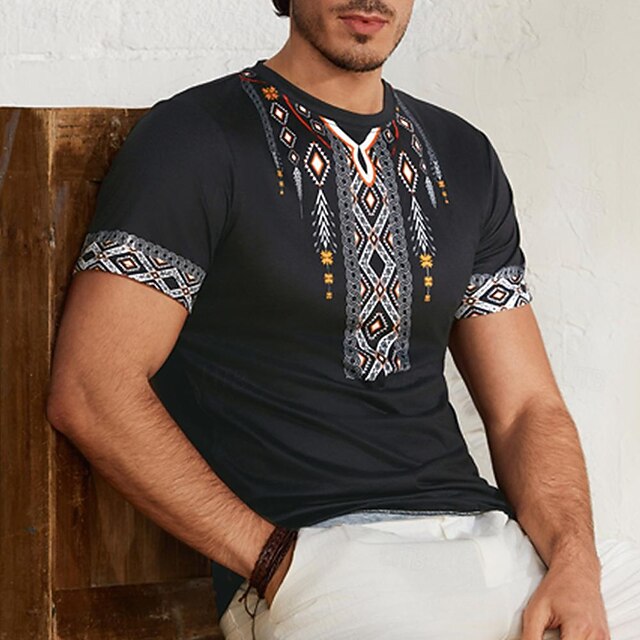 Highlights [Fabric]: Crafted from a high-quality polyester blend, this men's t-shirt offers a soft, breathable, and micro-elastic texture. Ideal for keeping cool and comfortable during spring and summer, the lightweight fabric ensures ease of movement and durability. [Fit]: Featuring a tailored fit, this t-shirt accentuates the wearer's physique while allowing for comfortable, relaxed wear. The crew neck and short sleeves contribute to its versatile appeal, making it suitable for a variety of occasions. [Design Highlights]: Boasting an intricate tribal and bandana print, this t-shirt stands out with its artistic and vibrant patterns in orange, grey, and white against a sleek black backdrop. The 3D print adds depth and sophistication to the design, with patterns adorning both the front and sleeves. [Occasions]: Perfect for casual outings, vacation wear, or ethnic-inspired looks, this t-shirt is a versatile choice for hiking, athleisure activities, and other relaxed events. Its exceptional design offers an easy way to add a touch of artistry and culture to any wardrobe. [Size Range]: Available in sizes S, M, L, XL, XXL, and XXXL, this t-shirt caters to a wide range of body types, ensuring a flattering fit for all adults. Perfect for everyday use. first-class materials and excellent craftsmanship ensure long-lasting durability.