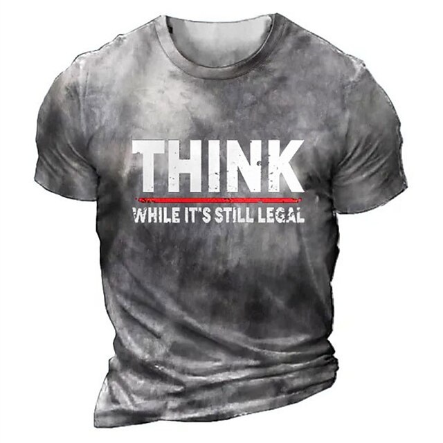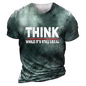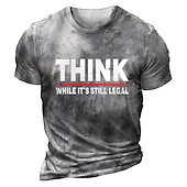 : The T-shirt boasts a distinctive graphic and letter design with a 3D print technique, featuring the thought-provoking message, "THINK WHILE IT'S STILL LEGAL." The distressed style gives it a vintage, edgy look, enhanced by a grey and black tie-dye pattern that adds a trendy vibe.
