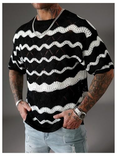 sizzling ! Men's Striped Crochet Knit Tops Hollow Out Crew Neck Short Sleeve Pullover Sweater Casual Knitwear