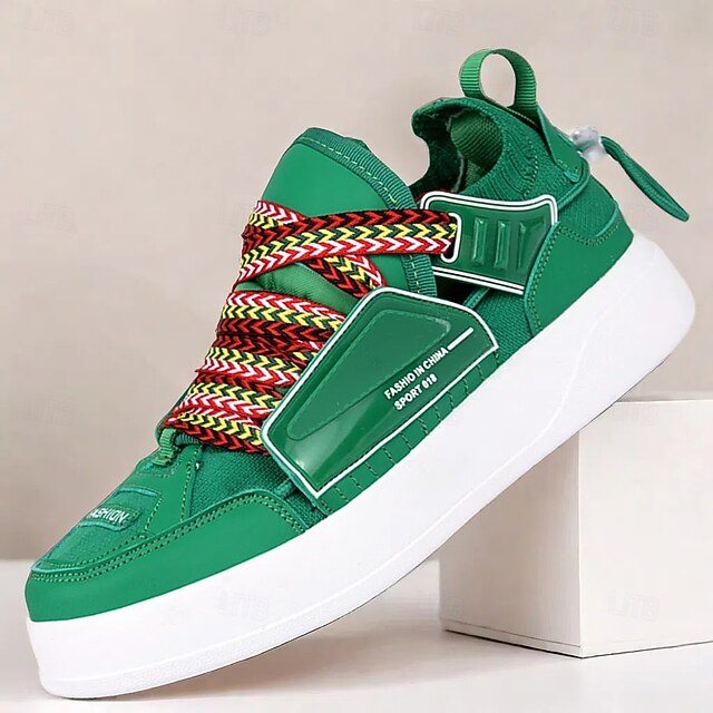 Highlights [Fabric] : The Men's High-Top Sneakers feature an upper made from high-quality PU leather, providing a durable and polished appearance suitable for everyday wear. [Silhouette] : These sneakers boast a modern, sporty design with a chunky white rubber outsole, offering excellent cushioning and support for daily activities. [Design Highlights] : The sneakers stand out with their vibrant green color, complemented by multicolor, patterned laces that inject a playful and one-of-a-kind touch. Additionally, the shoes are equipped with a sturdy Velcro strap across the midfoot for enhanced stability and style, complete with an embossed trendy slogan. [Occasions] : Perfect for streetwear aficionados and casual outings, these sneakers effortlessly blend comfort and contemporary style. Ideal for various activities, they are suitable for both casual and semi-sporty settings. [Sizes] : Available in a range of sizes from US7 / EU39 / UK6 to US10.5 / EU43 / UK9.5, catering to diverse fitting preferences. Perfect for everyday use. superior materials and excellent craftsmanship ensure long-lasting durability.