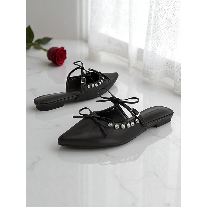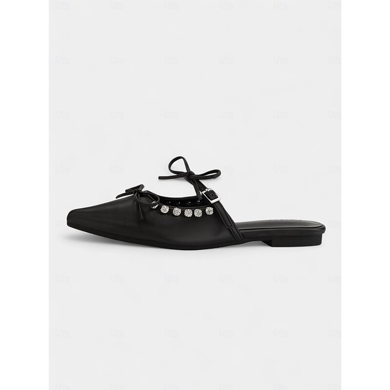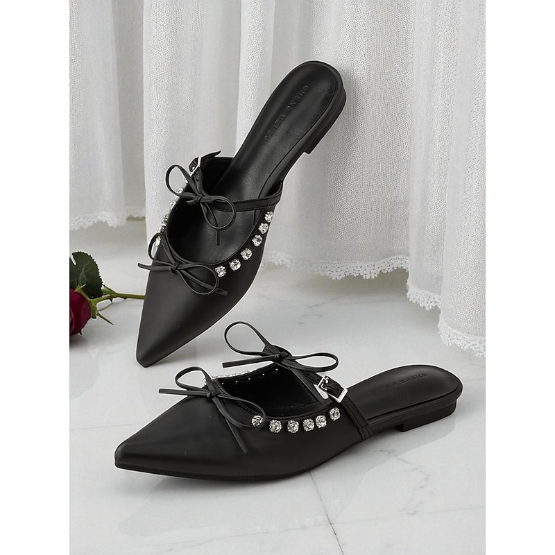 Women's Black Pointed Toe Flats with Rhinestone Embellishments and Double Bow Straps - Elegant Nightlife Party Shoes 1