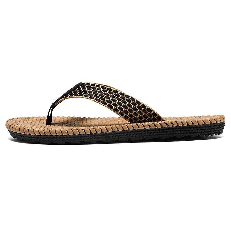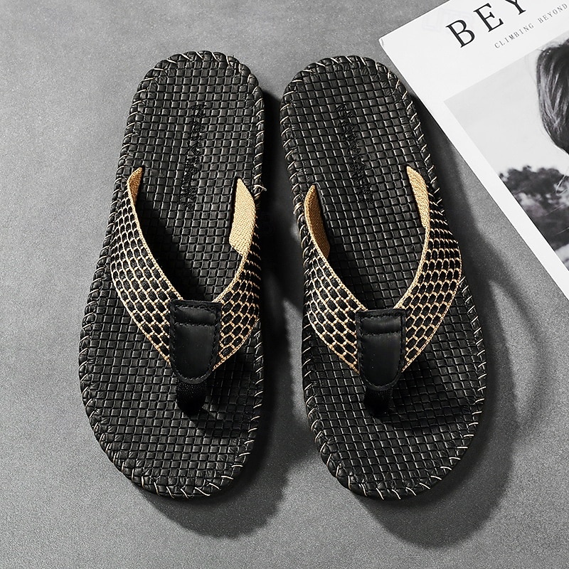 Highlights [Fabric] : Crafted with a breathable canvas upper, these men's flip-flops offer lightweight comfort and durability, perfect for warm-weather wear. The open-toe design further enhances breathability, ensuring your feet stay cool during spring and summer days. [Fit] : Designed in a casual loafer style, these flip-flops are easy to slip on, providing effortless comfort and a secure, relaxed fit, ideal for everyday use. [Design Highlights] : These modern flip-flops feature a unique woven strap design with a contrasting honeycomb pattern in black and beige, giving them a distinctive and eye-catching look. The EVA outsole provides a sturdy base, blending practicality with a chic appearance. [Occasions] : Perfect for casual summer outings and beach trips, these flip-flops seamlessly transition from home to daily activities, making them a versatile addition to your warm-weather wardrobe. [Size Range] : Available in sizes ranging from 39 to 45, these flip-flops cater to a variety of feet sizes, including larger, plus-size options, ensuring a comfortable fit for everyone. Perfect for everyday use. first-class materials and excellent craftsmanship ensure long-lasting durability.