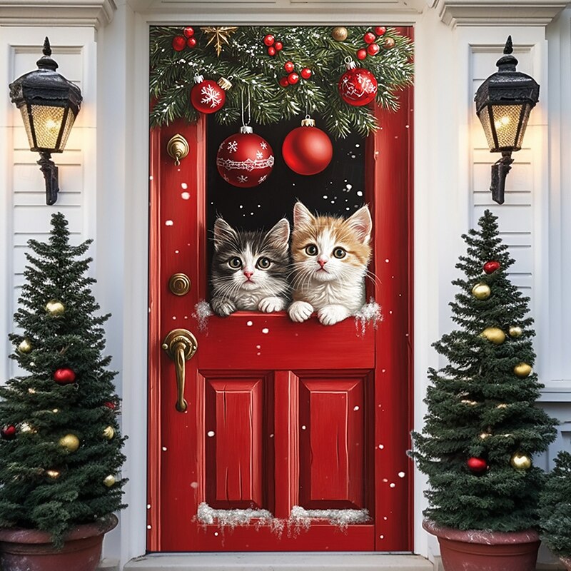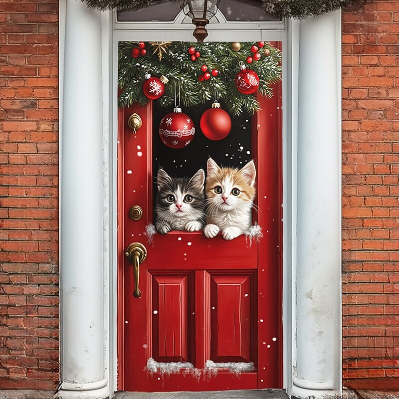 Christmas Door Decorations Door Covers Xmas Garland Ornaments Door Tapestry Door Curtain Decoration Backdrop Indoor/Outdoor Door Banner for Front Door Farmhouse Animal Cats