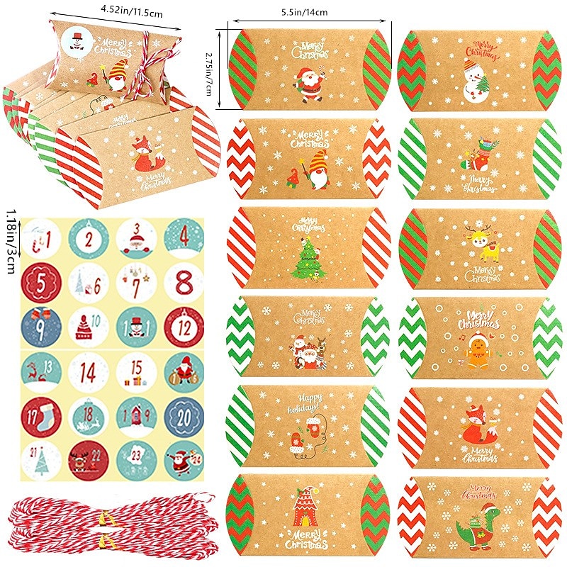 4. Package List: The package includes 24 pieces of cartons, 24 pieces of digital stickers, and 20 pieces of red and white cotton ropes. These items are suitable for holding small to medium-sized gifts like cookies, candies, and chocolates, creating a festive atmosphere for your family or other occasions.