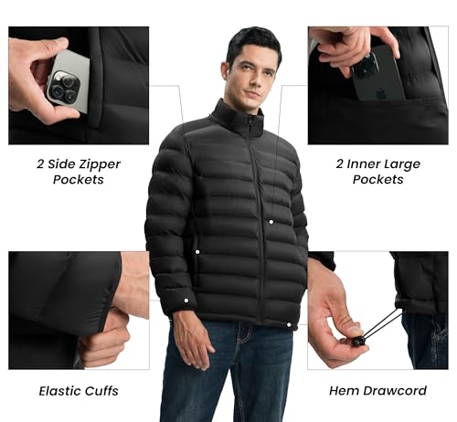 • 4 Pockets: Mens puffy jacket includes 2 hand zippered pockets,2 inner large pockets.superb for keeping keys, phone,wallet & small items