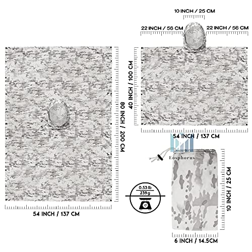 • ✅ Ultra-lightweight - Getting a special and lightweight winter gift for a family and friend is not convenient. This Winter Camo weighs only 8.5 ounces and fits in a compact pouch (6x10 inches). This plus size poncho normal size is 54 x 40 inch (L x W); unfolds up to 54 x 80 inch (L x W). You can easily convert it to a tent, camouflage shelter or awning cloth by using eyelets, rope and/or racks for awning.