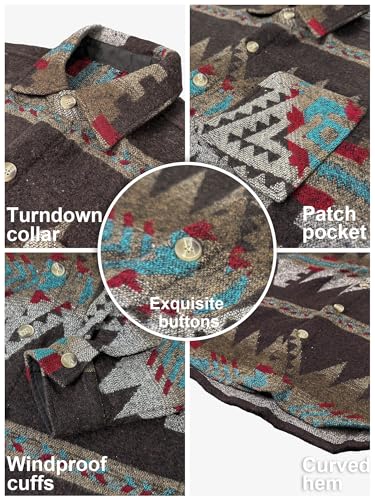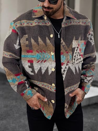 PLEPAN Men's Casual Aztec Print Cotton Button Down Jacket Long Sleeve Overshirt Turndown Collar Western Shacket Coat
