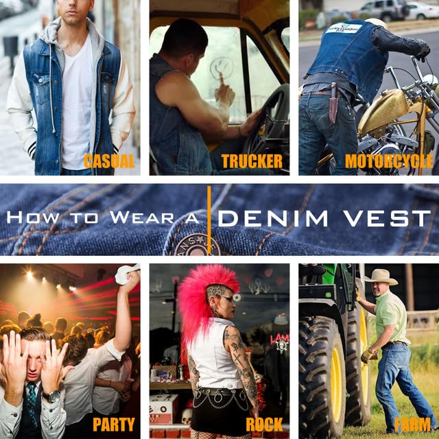 Fabric type: DenimCare instructions: Machine WashOrigin: Imported【SIZE】- Use the size chart found in the alternate images. We have a guide based on denim vest size or body weight, find it on the chart and order that vest size.【Multi Pockets】- 80's casual jean vest uses 2 front button chest pockets and 2 slanted side pockets, 2 inside pockets. Use them to store valuable items such as your phone, keys or wallet. You can also use them to keep your hands warm.【modern】- A modern classic fit, cut-off sleeve design and hood with adjustable drawstring make this denim vest a staple for best fashion activity.【MADE】- Unique retro sleeveless jean jacket uses tough stiches, sturdy buttons. It is suitable for party, outside activities, date, business work and other casual occasions in all seasons. can be worn with a variety of outfits.【MATERIAL】- 80% Stretchy Denim, 20% polyester. Machine-wash cold inside-out with like colors, tumble dry in low heat, do not bleach. Perfect for everyday use. first-class materials and excellent craftsmanship ensure long-lasting durability.