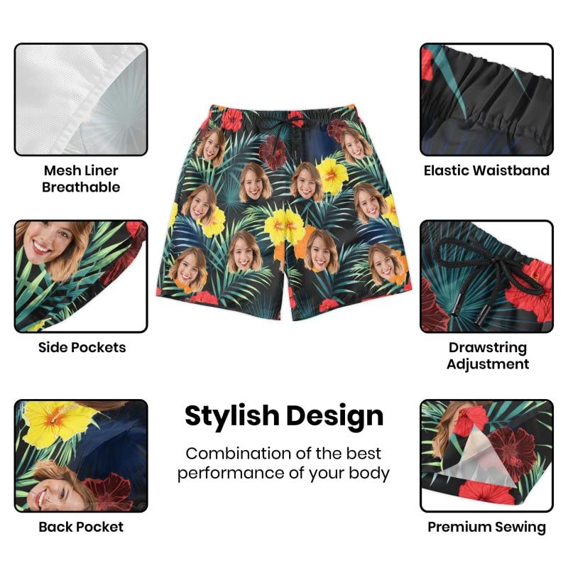 • If you wanna try something different this summer,our fun custom face swim shorts will be a must.If you wanna send a custom gift for your friend or family member,our personalized face swim shorts will give a big surprise to them.Only need to upload your favourite image and we will crop the face onto the swim trunks with a supreme image for foremost results.